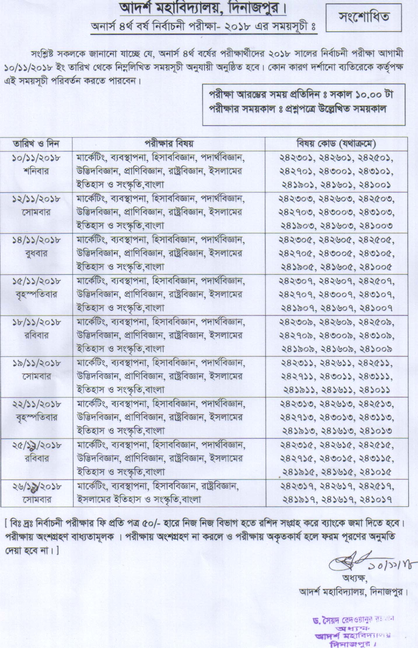 অনার্স ৪র্থ বর্ষের পরীক্ষার্থীদের ২০১৮ সালের নির্বচনী পরীক্ষার সময়সূচী।