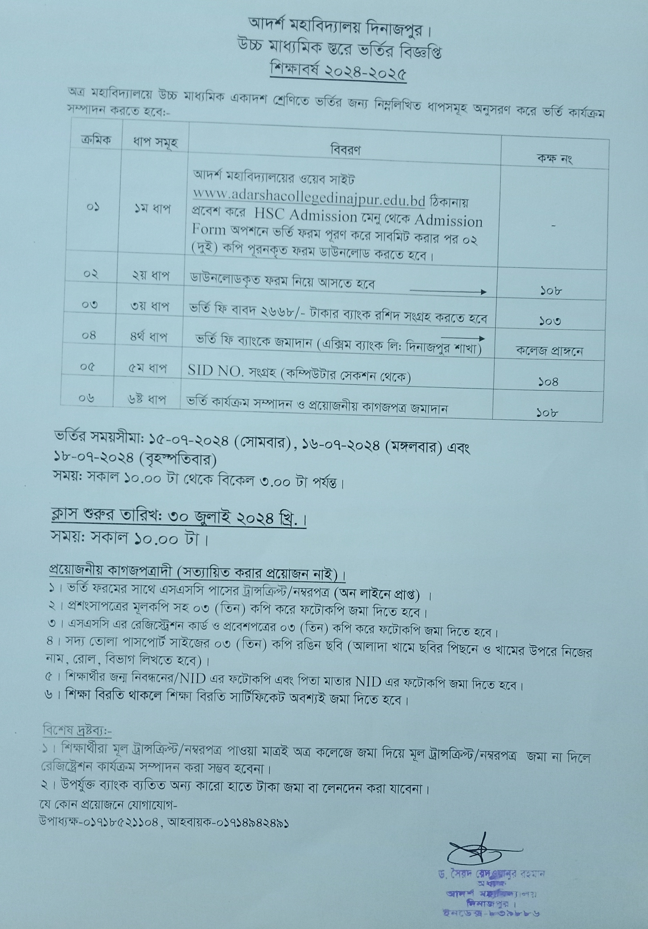 আদর্শ মহাবিদ্যালয় দিনাজপুর, উচ্চ মাধ্যমিক একাদশ শ্রেণি (২০২৪-২০২৫) শিক্ষাবর্ষ ভর্তি ধাপসমূহ।