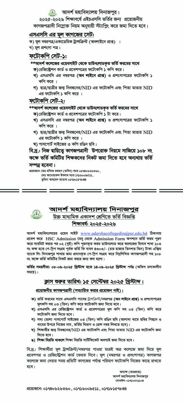 আ্দর্শ মহাবিদ্যালয়ে দিনাজপুর এ ২০২৫-২০২৬ ইং সালের ভতির নোটিশ তাং- ০৭.০৯.২৫ ইং